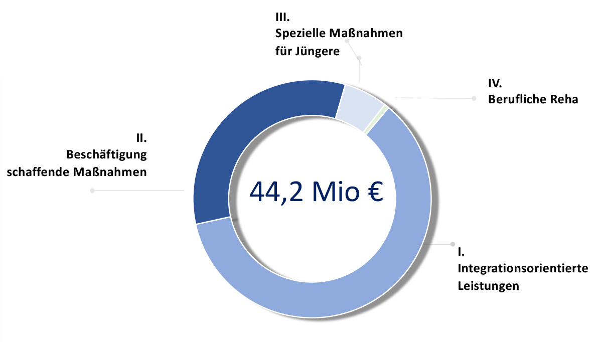 Für „beschäftigungsschaffende Maßnahmen“ werden ca. 33 Prozent des Eingliederungsbudgets eingesetzt. Hier steht das Instrument Teilhabe am Arbeitsmarkt (§ 16i SGB II) im Fokus.